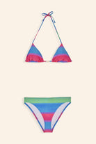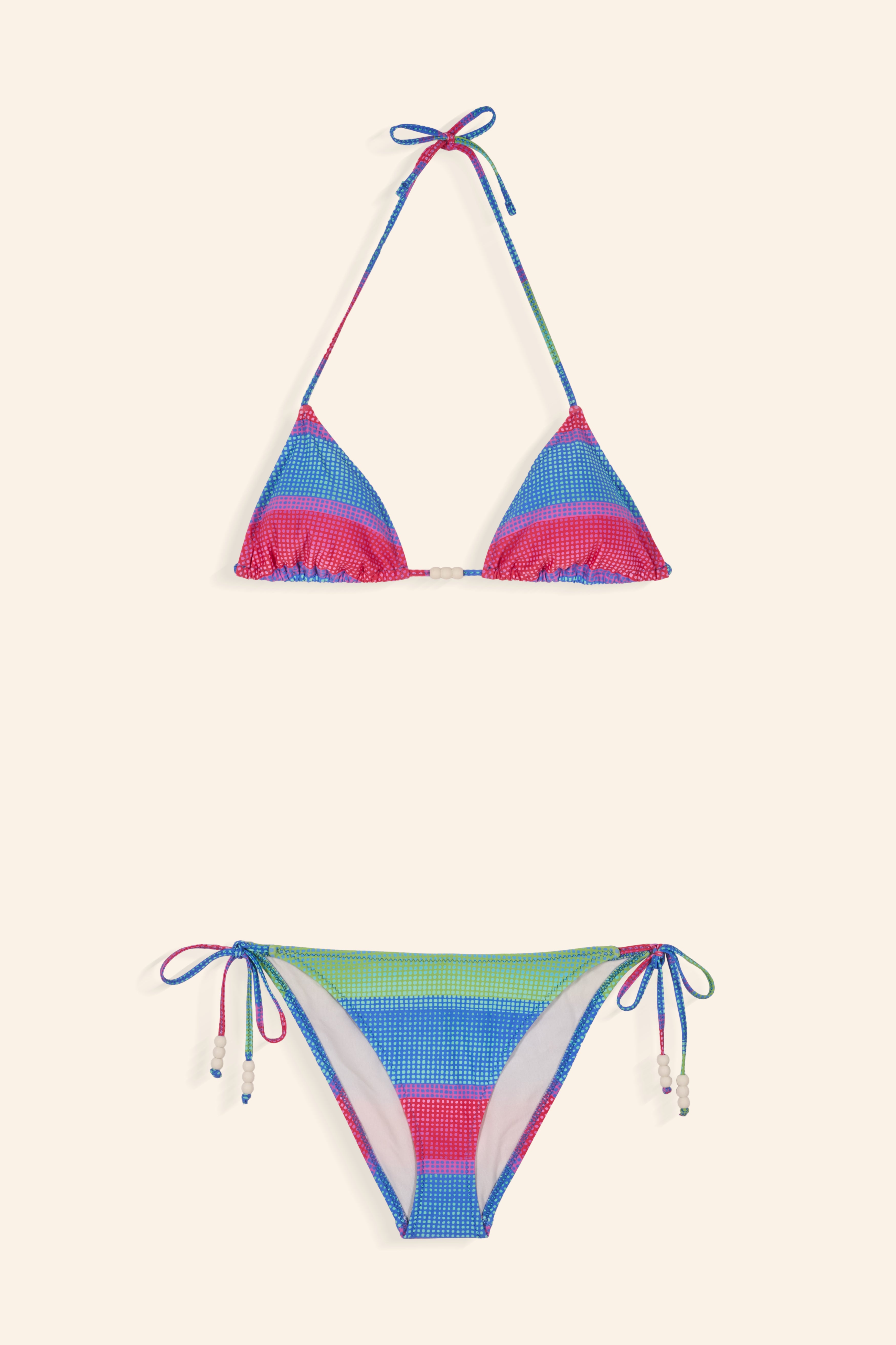 This rainbow art stripe print found in Brazil with the mix of colorful beads is the final touch of a dream bikinis inspired by the founder. The Rosa bikinis embrace joy, seduction and affirmation of colors.