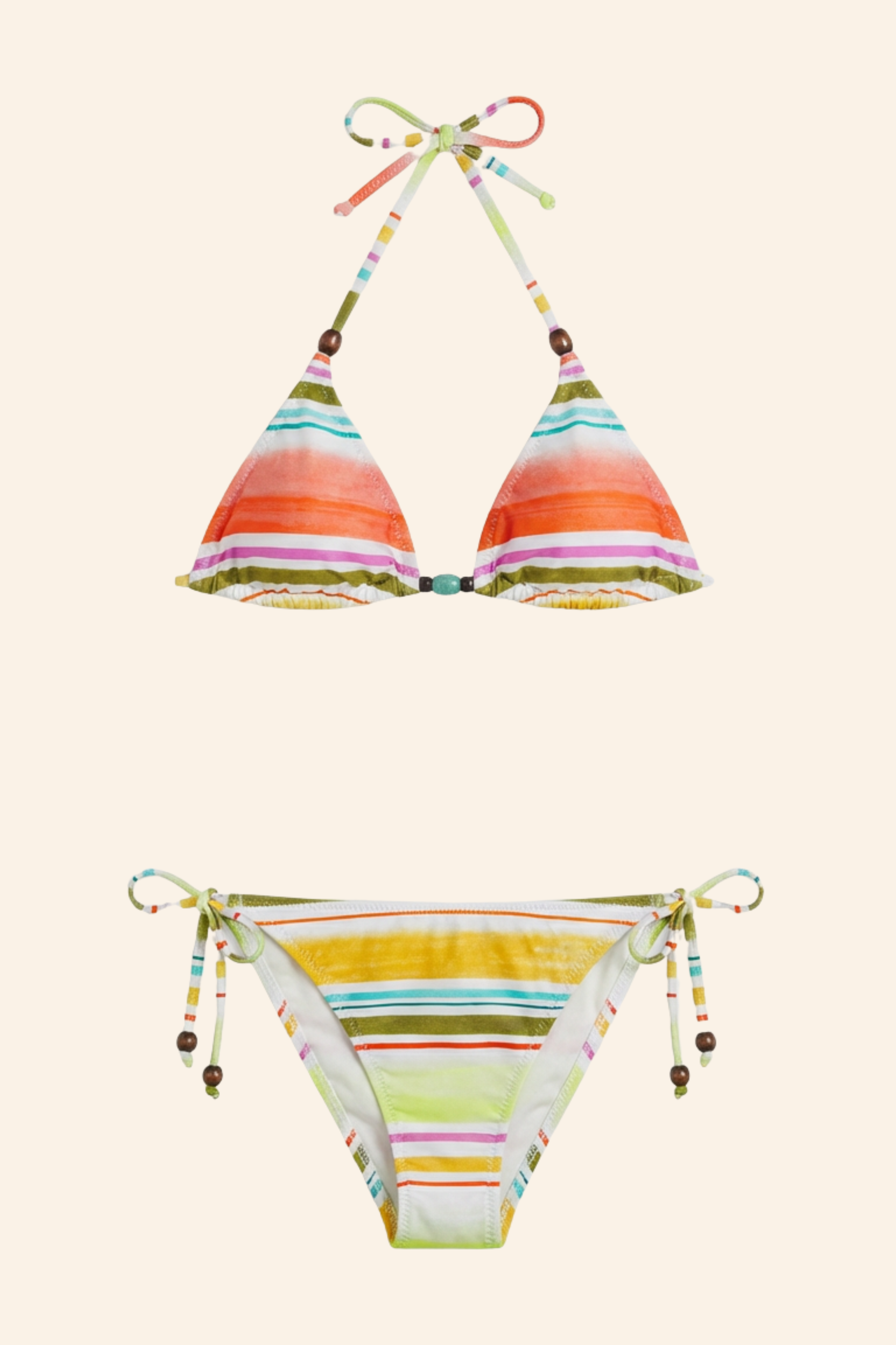 Ce motif aquarelle à rayures, déniché au Brésil et orné de perles colorées, apporte la touche finale à une collection de bikinis de rêve, inspirée par la créatrice. Les bikinis Rosa célèbrent la joie, la séduction et l'affirmation des couleurs.