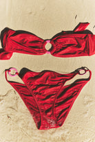 The Emma Red model has two medium circles on each side of the bottoms. This model has a lower cut bottom that flatters any body shape.