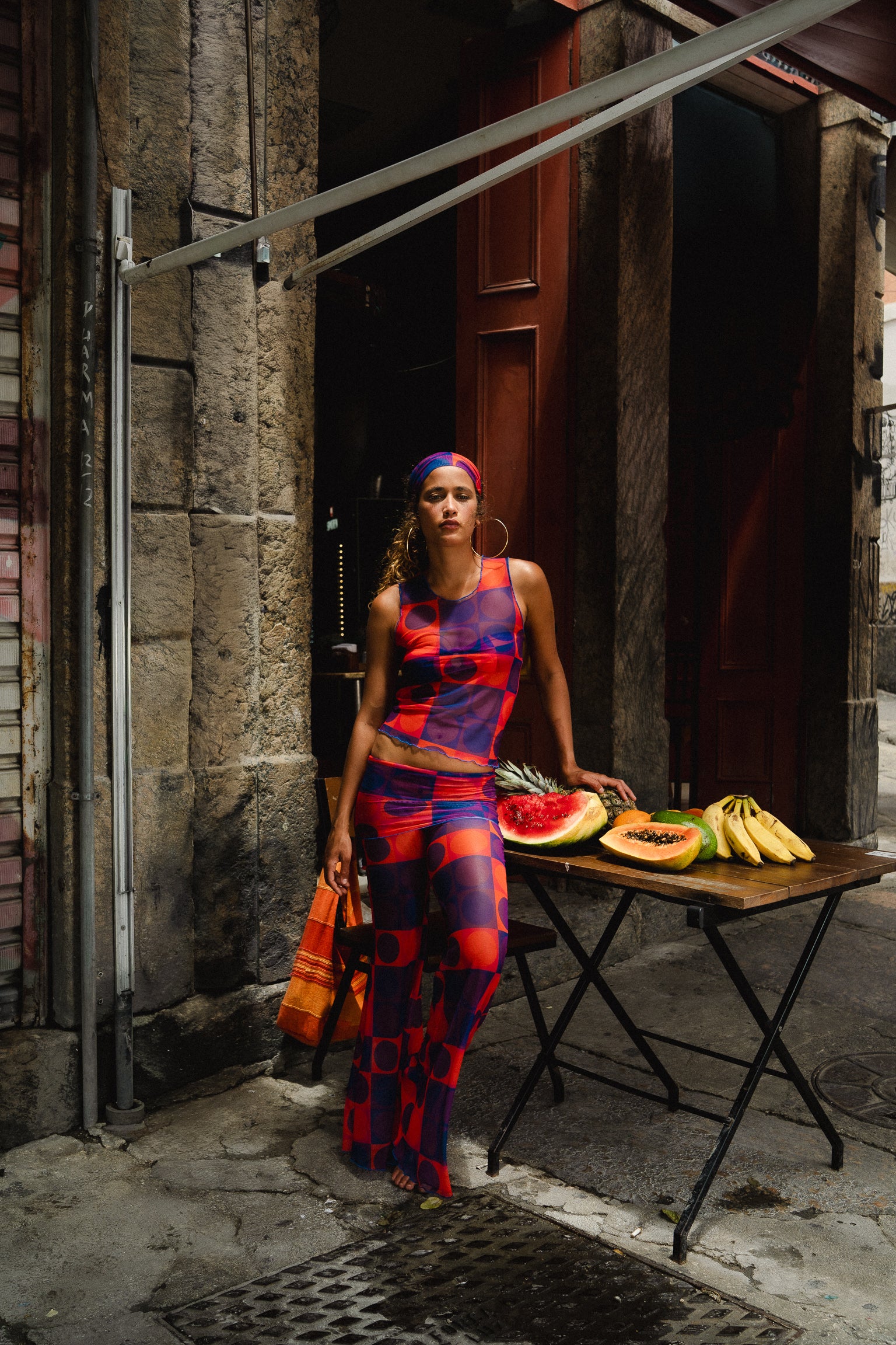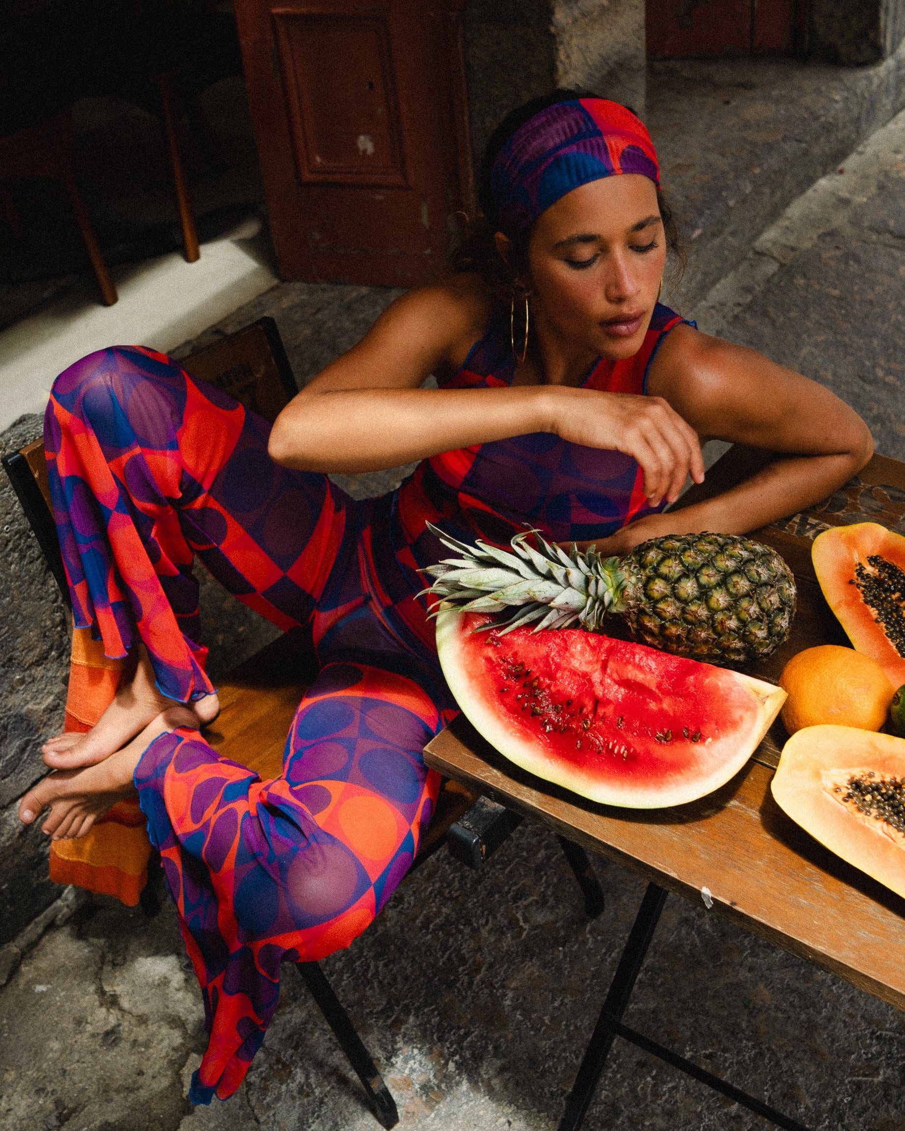 Sa taille basse épouse le corps tandis que sa transparence subtile et son imprimé ondulé apportent mouvement et légèreté. À porter sur un maillot pour un look solaire en journée, ou associé au Barbi Top pour une silhouette coordonnée et affirmée.